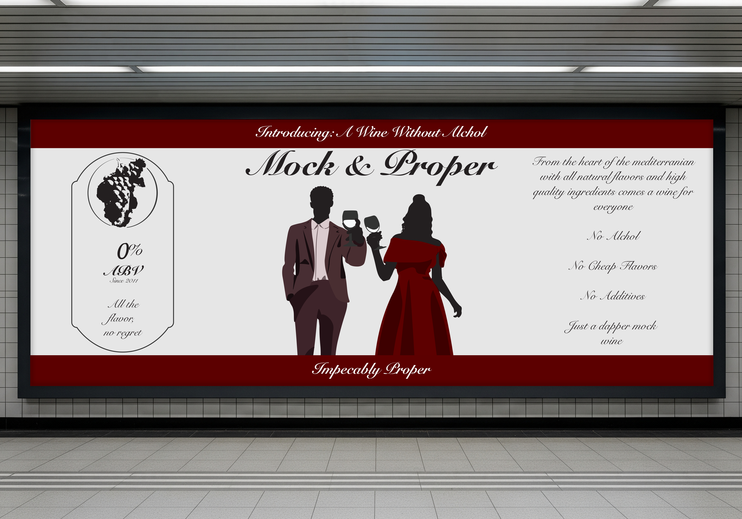 This is a project to show the capabilities I have with marketing a product and/or company. This company is a fake non-alcoholic wine company called Mock & Proper. I made mock ups for wine bottles, to business cards and marketing posters, as seen below.